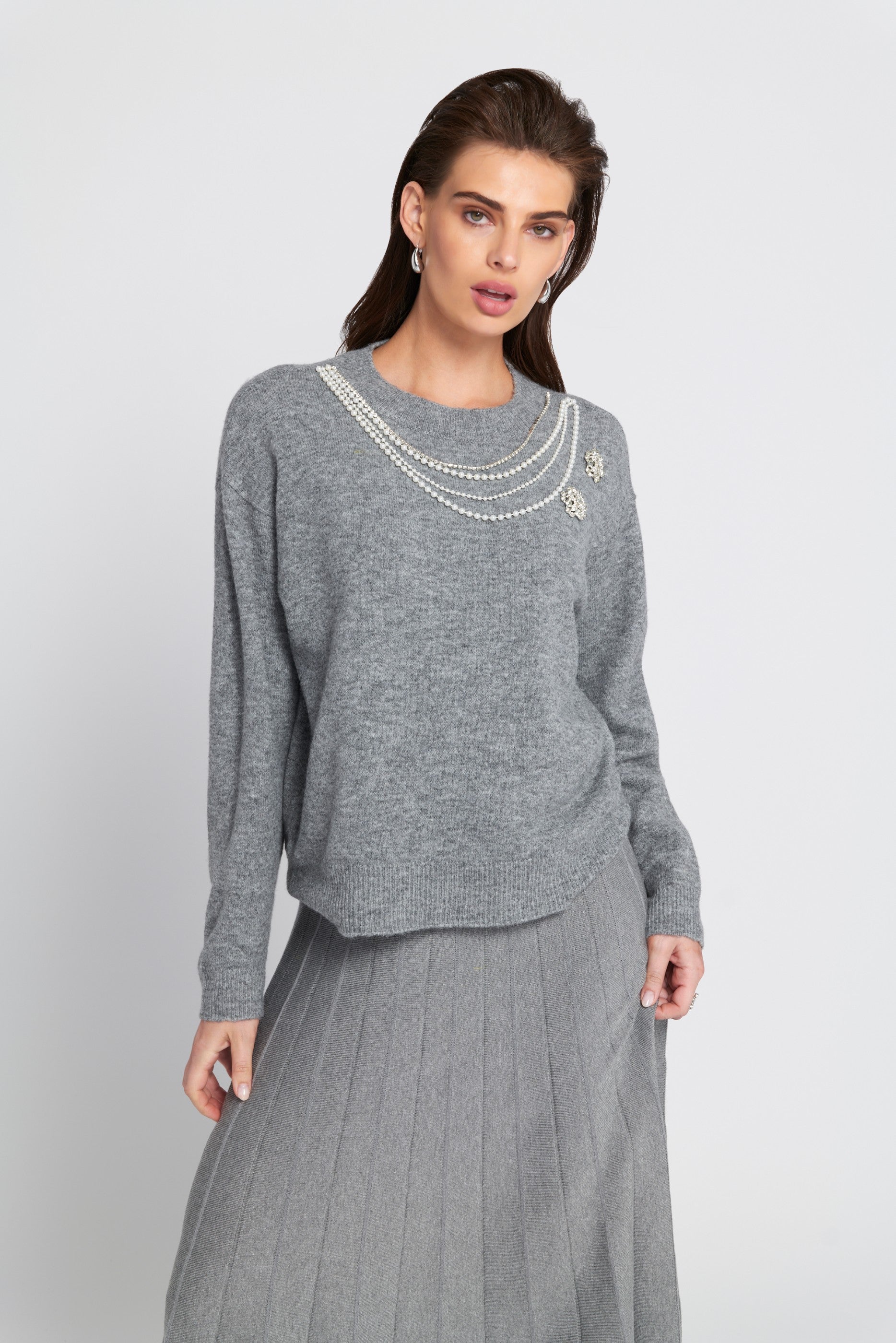 - This soft knit sweater features elegant faux pearl embellishments along the neckline for an instantly dressed look. The relaxed fit offers easy comfort while still feeling structured and flattering. Ribbed trims at the collar, hem, and cuffs help retain shape over time. Lightweight but cozy, it’s an ideal layering piece for transitional weather. Made with a stretchy recycled-poly blend that moves with you effortlessly. Subtle floral accents add a playful, polished finish to your everyday outfit.