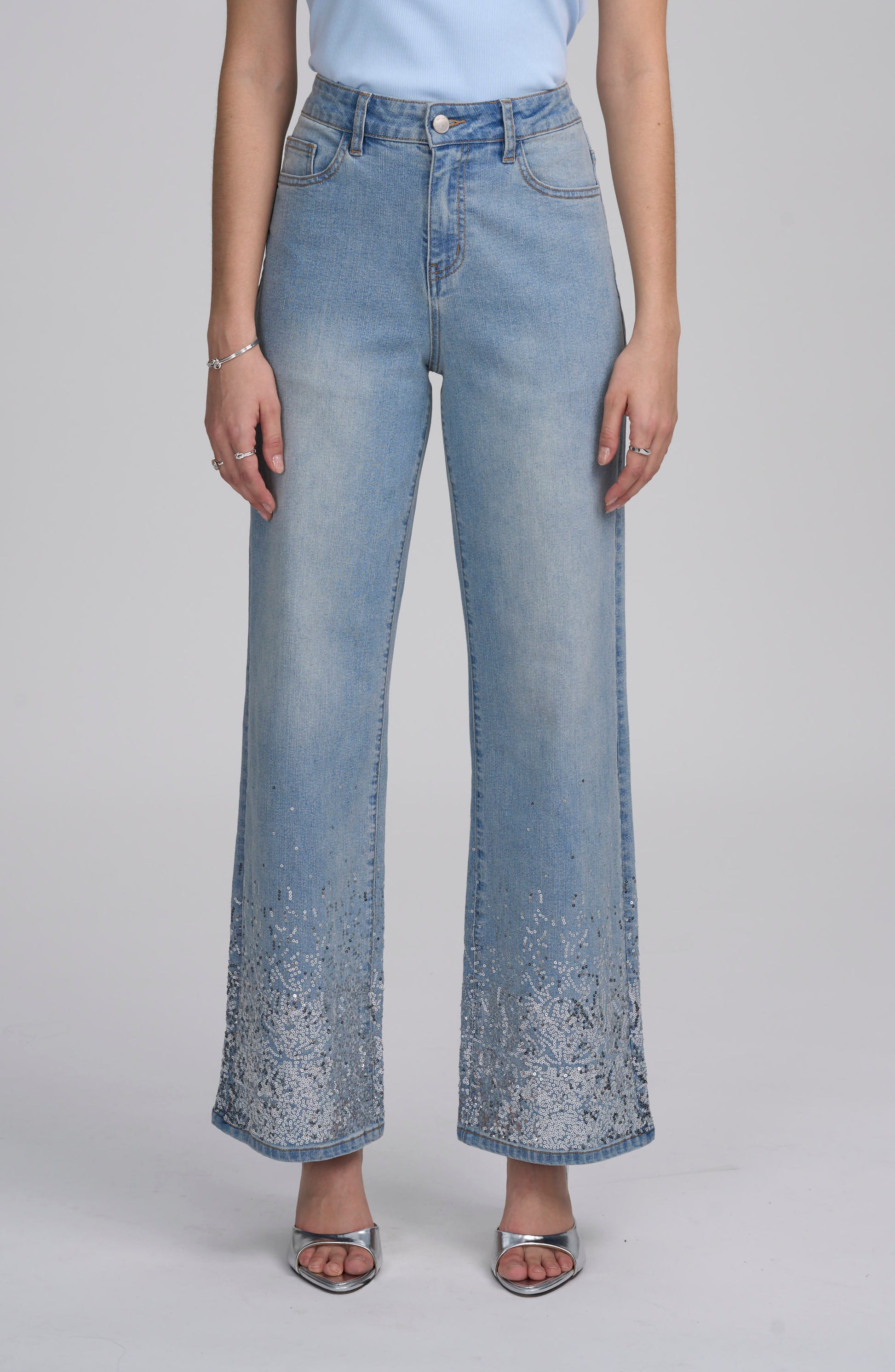 High-rise straight leg jean features classic five-pocket styling with subtle sequin detailing at the hem, offering a flattering fit, structured feel, and a refined statement that elevates everyday denim dressing.