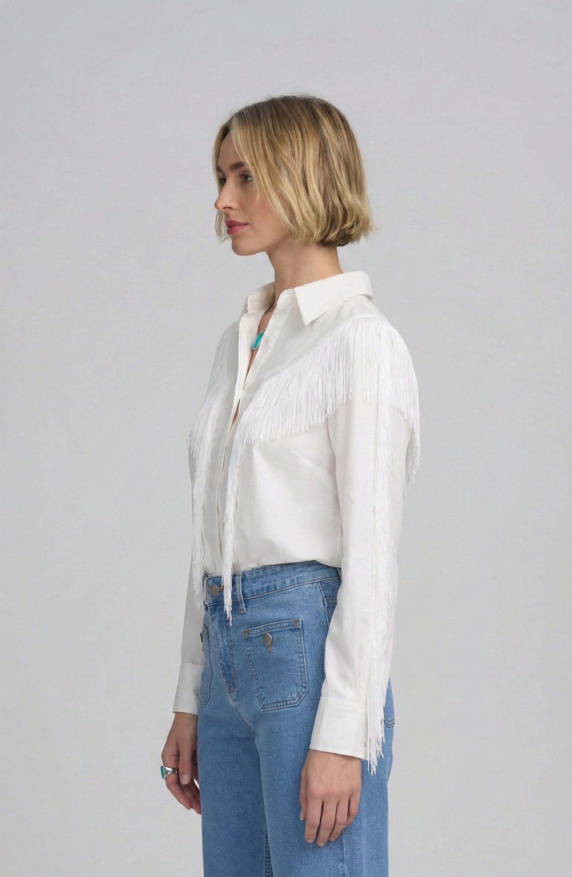 Button-front shirt with flowing fringe panels, soft structured collar, and breathable lyocell-cotton blend, offering movement, comfort, and polished ease for day-to-night styling with lightweight feel and artisanal detailing and easy care wearability.